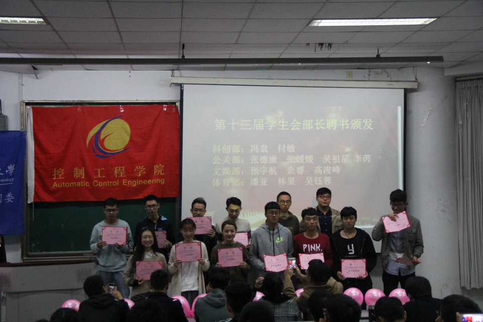 为表彰本学院上一届分团委优秀学生干部及欢迎新干事加入控制分团委,控制工程学院于2017年10月20日晚七点在4213教室举办了第十四届分团委学生会换届表彰大会。控制工程学院分团委书记田晓旭老师出席了本次表彰大会,上届学生会主席孙小堂及本届控制工程学院分团委学生会所有成员均到场参加会议。