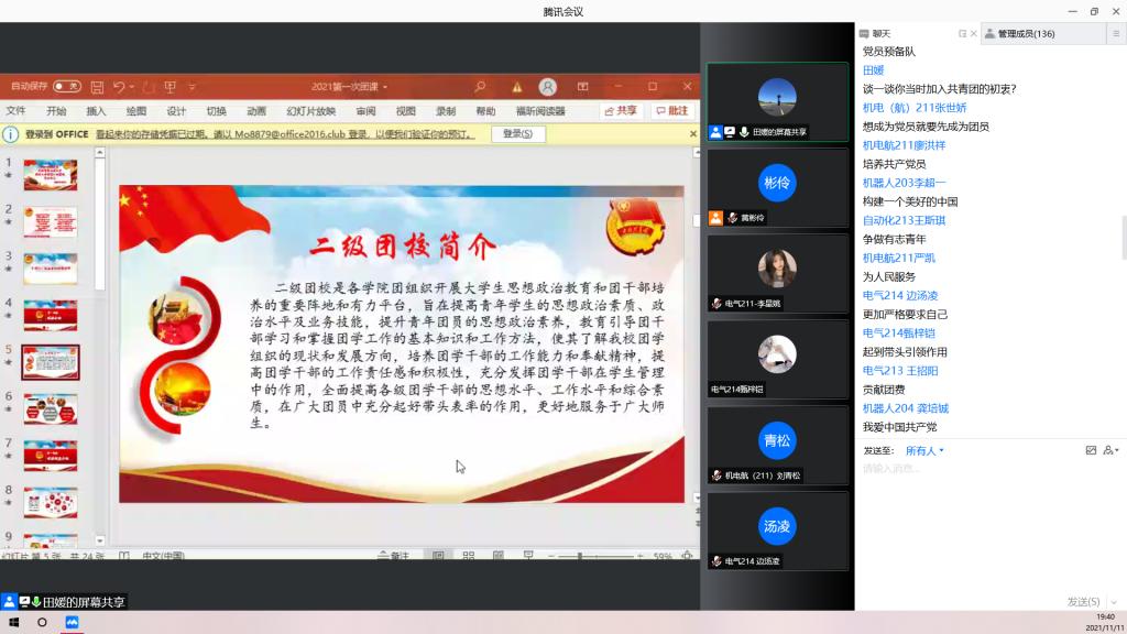 2021年11月11日,2021~2022年度成都信息工程大学控制工程学院二级团校开班仪式正式举行。学院积极响应国家疫情防控号召,通过线上方式举行本次开班仪式,分团委书记田媛老师出席本次仪式并担任主讲老师,控制工程学院校团委组织部全体成员等158位同学参加本次仪式。