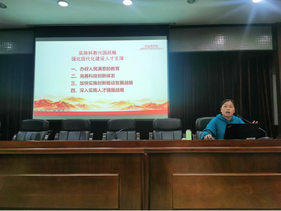 张建红以《深入学习党的二十大报告新思想、新观点》为题,对党的二十大报告的新思想、新观点进行解读。她围绕党的二十大的主题、过去五年的工作和新时代十年的伟大变革、开辟马克思主义中国化时代化新境界、新时代新征程中国共产党的使命任务、加快构建新发展格局,着力推动高质量发展、实施科教兴国战略、强化现代化建设人才支撑等方面,对党的二十大报告进行深度阐释并重点解读了报告中的“三个务必”、“五个重大原则”等内容。她特别谈到,高质量发展是全面建设社会主义现代化国家的首要任务,教育、科技和人才是基础性、战略性支撑,并结合高校办学的使命和任务,重点围绕办好人民满意的教育、完善科技创新体系、加快实施创新驱动发展战略、深入实施人才强国战略等方面进行了解读。