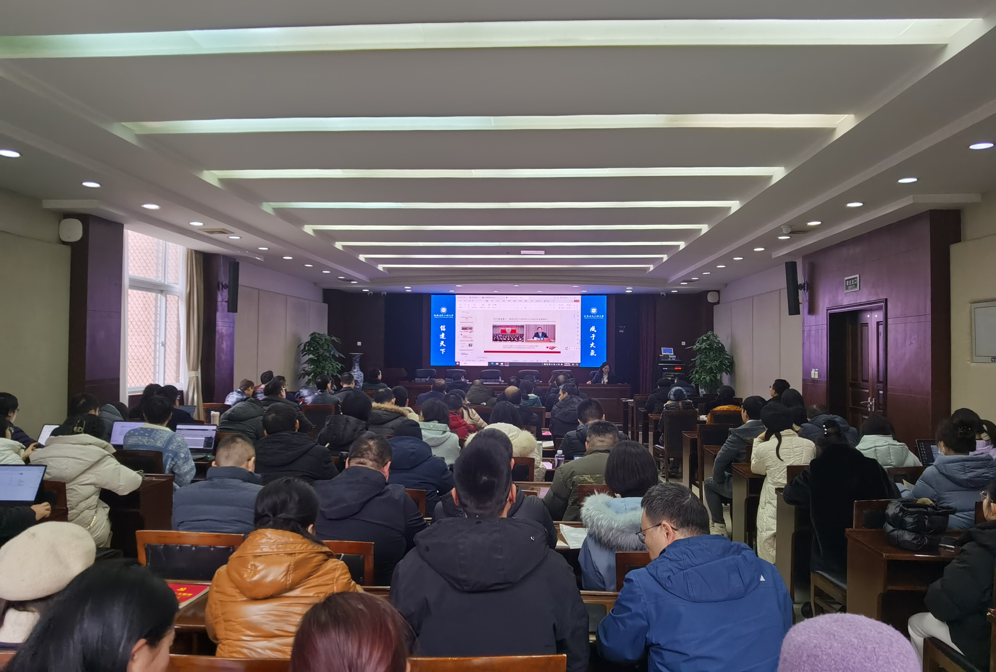 1月16日,betway88西汉姆联在行政楼一会议室召开中共四川省委十二届四次全会精神专题学习和课程思政交流会,我校马克思主义学院丁小珊院长应邀作宣讲和组织交流,全院教职工集体参加了学习。会议由学院党委书记胡雪飞主持。