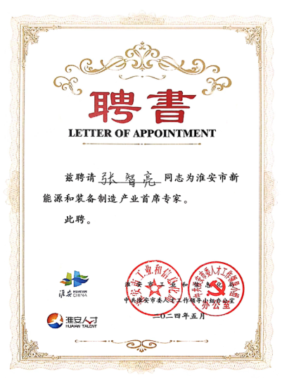 58日,中共淮安市委人才工作领导小组办公室、淮安市工业和信息化局举行淮安市新能源和装备产业首席专家张智亮教授聘任仪式。淮安市委组织部副部长淮安市人才工作领导小组办公室主任姜洪洋向张智亮教授颁发聘书。