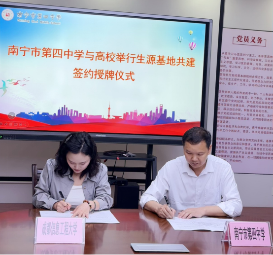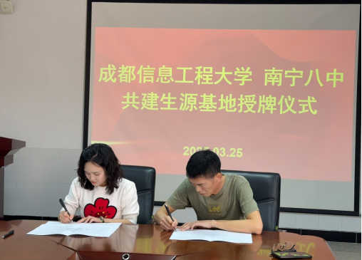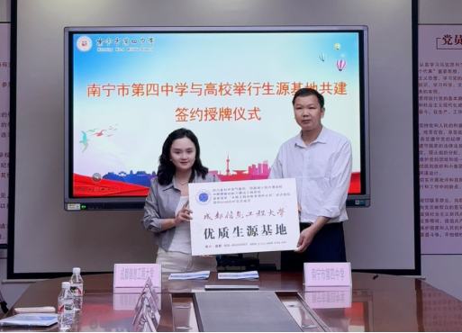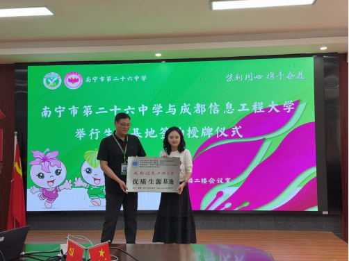 活动期间,先后走进南宁市第四中学、第八中学和第二十六中学,与各中学领导共同签署了优质生源基地合作协议,并为各中学授予了“优质生源基地”牌匾。签约仪式上,王俊淋详细介绍了学校的办学历史、学科特色、硕博授权点、科研实力及人才培养成果。她表示,此次合作旨在通过资源共享、课程共建、科技互动等形式,为中学生提供更多了解前沿科技、参与创新实践的机会,助力基础教育与高等教育协同发展。三所中学的校领导对成都信息工程大学的办学理念和人才培养模式高度认可,希望通过生源基地平台,进一步激发学生科学兴趣,为高校输送更多具有创新潜质的优秀学子。