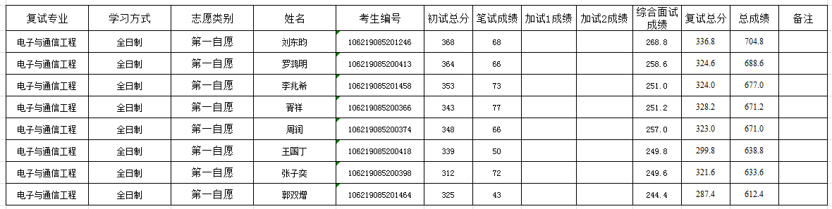 2019年控制工程学院复试成绩公布(第一批--第一志愿)