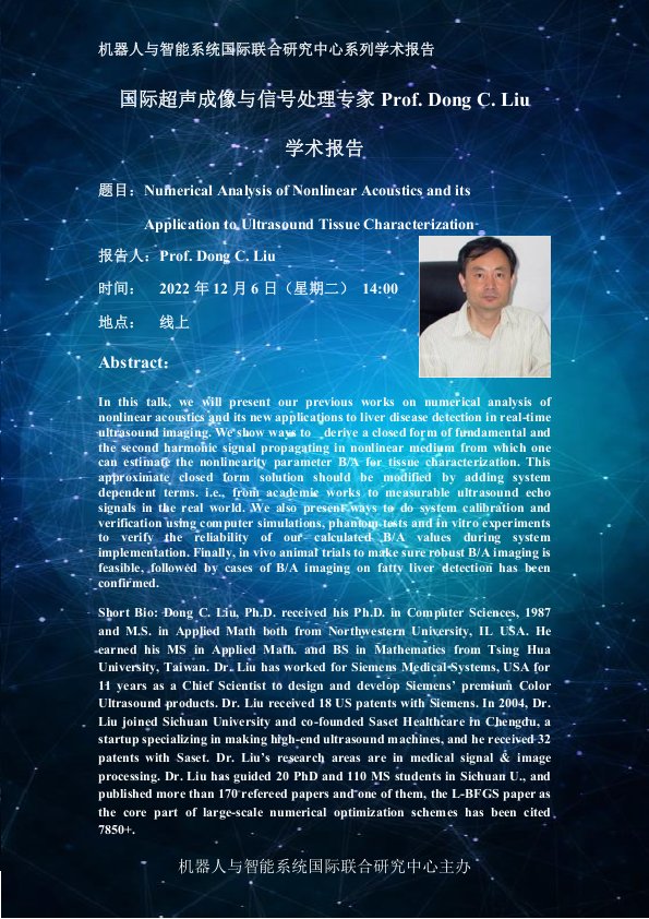 机器人与智能系统国际联合研究中心系列学术报告国际超声成像与信号处理专家Prof. Dong C. Liu学术报告